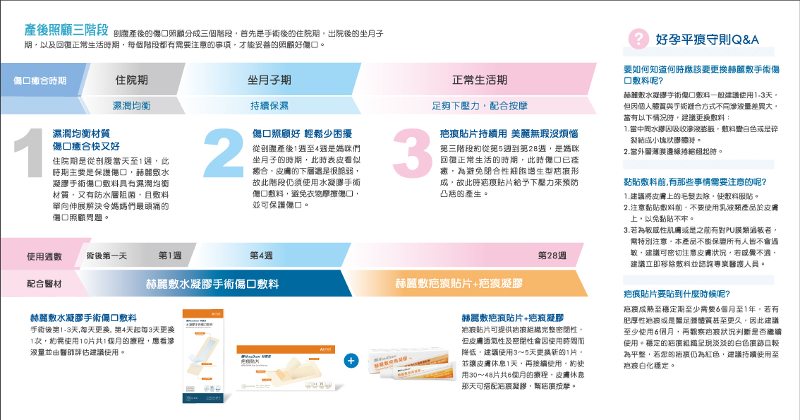 為親膚性佳、低過敏、不易刺激皮膚的醫療級感壓膠敷料。針對縱向疤痕的單向伸展設計,可使關節部位保有正常的伸展活動;同時橫向非彈性設計能有效固定疤痕壓制疤痕增生,並幫助新生組織恢復平整,預防疤痕產生。